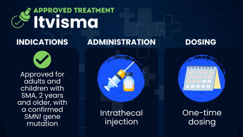 Itvisma (onasemnogene abeparvovec-brve) is a one-time gene therapy that’s approved for adults and children, 2 years and older, with spinal muscular atrophy (SMA).